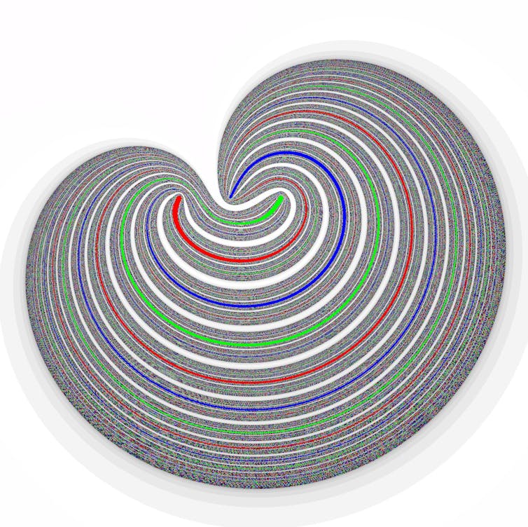 À l’étape n, la ligne blanche, qui est en fait la frontière entre les trois pays, n’est presque plus visible à l’œil nu. Ioannis Iakovoglou, Université de Bourgogne, Fourni par l’auteur