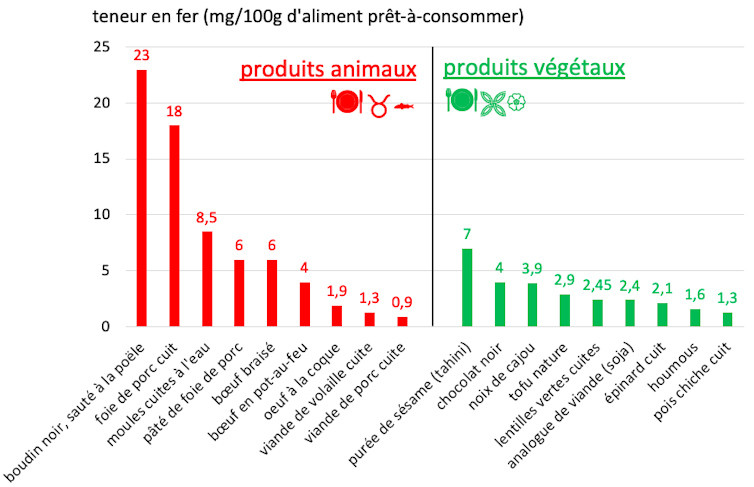Les produits animaux sont ainsi généralement plus riches en fer, y compris par rapport aux produits végétaux recommandés pour leur teneur en protéines importante et donnés comme alternatives aux viandes.