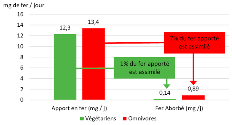 Les chercheurs ont démontré que le premier menu réduisait fortement la biodisponibilité du fer. Seuls 1 à 15 % du fer non héminique est absorbé contre 30 à 49 % avec un menu plus favorable. Au final, l’absorption du fer s’est avérée de 4 à 8 fois plus importante avec le repas riche en viande, en vitamine C, que le menu sans viande avec consommation de thé.
