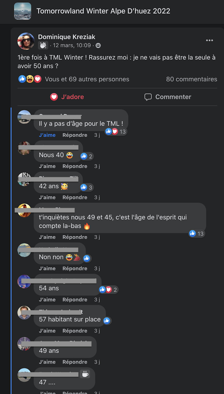 Extrait d’une discussion d’un groupe Facebook de festivalier en amont du festival Tomorrowland Winter, 2022.