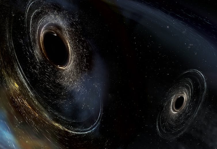 Par conséquent, il nous faut regarder au-delà de la Terre pour identifier les bonnes sources. Et c’est ici que les trous noirs binaires, avec leurs grandes masses et leurs vitesses orbitales proches à celle de la lumière, entrent en scène.
